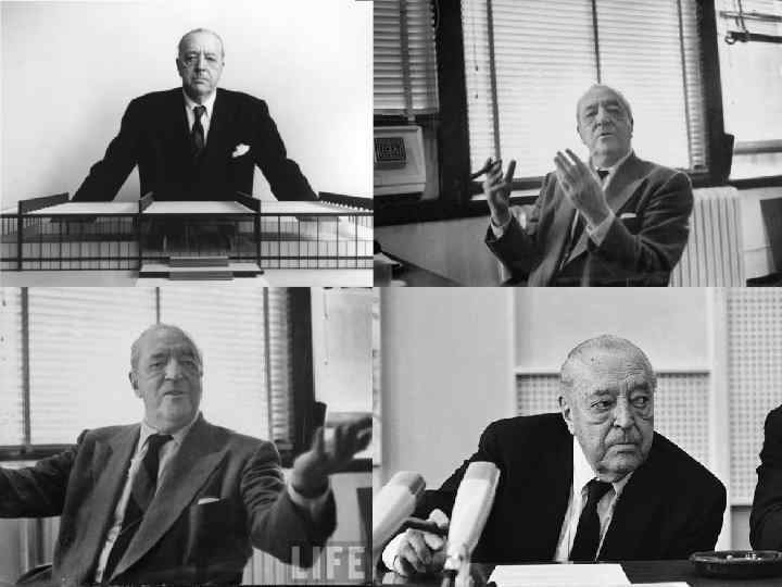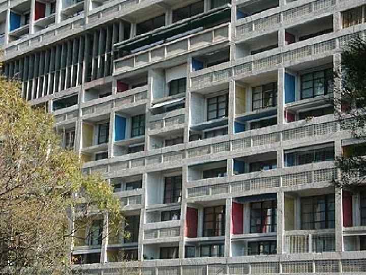 Ле Корбюзье (настоящее имя Шарль Эдуар Жаннере-Гри, 1887— 1965) — французский архитектор швейцарского происхождения, пионер модернизма, представитель архитектуры интернационального стиля, художник и дизайнер. После освобождения Франции начались восстановительные работы. Корбюзье был приглашен властями как проектировщик-градостроитель. Им были выполнены планы реконструкции городов Сен-Дьё (1945), Ла-Рошель (1946), ставшие новым вкладом в градостроительство. В этих проектах впервые появляется «жилая единица» . По заказу промышленника Дюваля возводит здание мануфактуры Клод и Дюваль (1946— 1951) — четырёхэтажный блок с производственными и офисными помещениями, со сплошным остеклением фасадов. Были применены «солнцерезы» , — изобретённые Корбюзье особые навесные конструкции, защищающие остеклённый фасад от прямых солнечных лучей. С этого момента солнцерезы становятся своеобразным фирменным знаком построек Корбюзье, где они выполняют и служебную, и декоративную роль. В 1946 г. Корбюзье вместе с другими известными архитекторами приглашён для проектирования комплекса штаб-квартиры ООН в Нью-Йорке. Он работал над ним с января по июнь 1947 г. Тем не менее, общая планировка комплекса и особенно высотное 50 -этажное здание Секретариата (1951) в значительной степени отражают его проектные предложения.