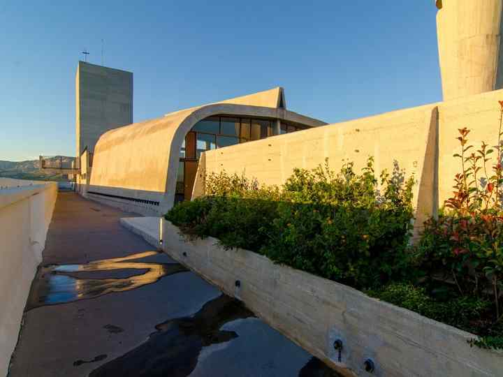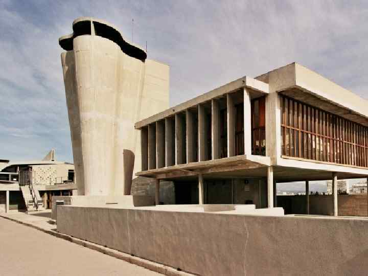 Начало 50 -х гг. — это начало нового периода у Корбюзье, характерного радикальным обновлением стиля. Он уходит от аскетизма и сдержанности своих прежних произведений. Теперь его почерк отличается богатством пластических форм, фактурной обработкой поверхностей. Построенные в эти годы здания вновь заставляют говорить о нём. Прежде всего это Марсельский блок (1947 — 1952). В этом проекте также широко применялось пропорционирование по системе «Модулор» . Подобные Жилые Единицы (частично видоизменённые) были возведены позже в городах Нант-Резе (1955), Бри-ан-Форе (1961), Фирмини (1968) (Франция), в Западном Берлине (1957). В 1950 г. по приглашению индийских властей штата Пенджаб Корбюзье приступил к осуществлению самого масштабного проекта — проекта новой столицы штата, города Чандигарх. Город, включающий административный центр, жилые кварталы со всей инфраструктурой, школы, гостиницы и пр. , строился в течение примерно десяти лет (1951 -1960, достраивался на протяжении 60 -х гг. ). Постройки, спроектированные непосредственно самим Корбюзье, относятся к Капитолию, административному центру города. Это здания Секретариата, Дворца Правосудия и Ассамблеи. Каждое из них отличается яркой характерностью образа, мощной монументальностью и представляет собой новое слово в архитектуре того времени. Как и в Марсельском блоке, для наружной отделки в них применена особая технология обработки бетонной поверхности, так называемый «béton brut» ). Эта техника, ставшая особенностью новой стилистики Ле Корбюзье, была подхвачена позже многими архитекторами Европы и стран других регионов, что позволило говорить о возникновении нового течения «брутализм» .