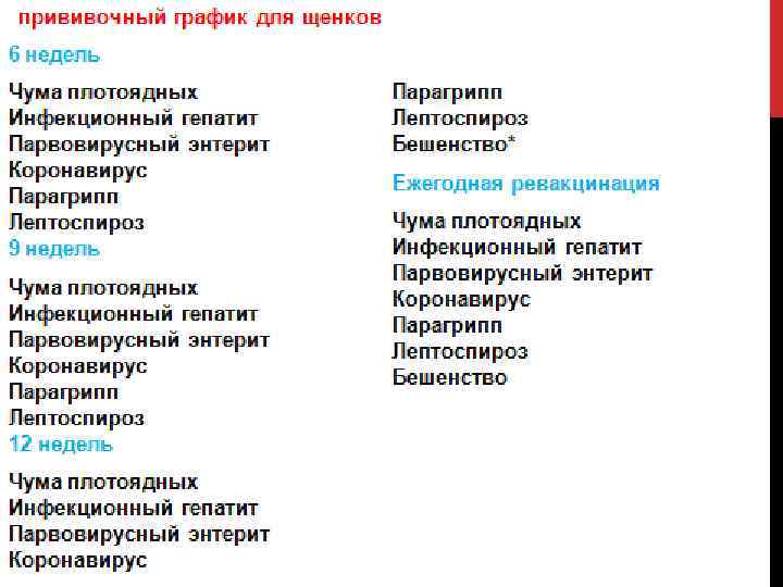 Вакцинация щенков Щенки очень восприимчивы к определенным инфекционным заболеваниям: к чуме плотоядных, инфекционному гепатиту, парвовирусному энтериту коронавирусу, парагриппу, лептоспирозу, бешенству. необходимо привить щенков до достижения ими 4 месячного возраста. После первой вакцинации, рекомендуется в течение года делать ревакцинации для поддержания активного иммунитета против инфекционных заболеваний.