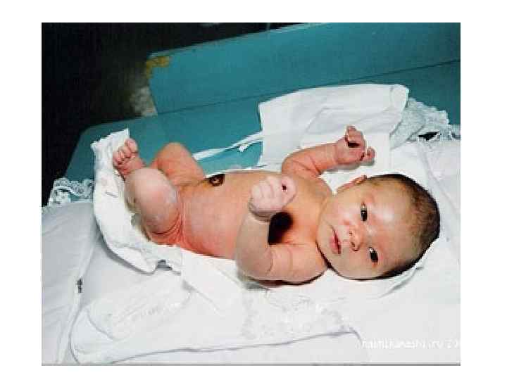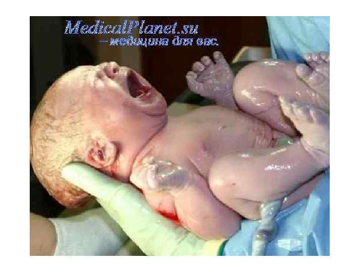 • Новорождённого после рождения принимают в подогретую стерильную пеленку. • Чтобы избежать попадания слизи в верхние дыхательные пути мягким резиновым стерильным балончиком или электроотсосом производят удаление слизи из носовых ходов и ротика. • Новорожденный рождается слегка синюшным, делает первый вдох, издает крик, двигает ручками и ножками и начинает быстро розоветь. • И именно в этот момент его укладывают на живот маме, для того чтобы она увидела и потрогала своего ребенка. • Это очень полезно не только для ребенка (таким образом происходит его первый контакт с внешним миром), но и для морального состояния мамы, она, увидев малыша, заметно успокаивается, что благоприятно сказывается на дальнейшем течении родов и послеродового периода. • В настоящее время это практикуют почти во всех роддомах.