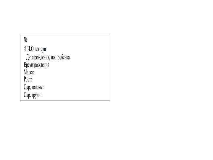 Первичные мероприятия. • Отсасывание слизи изо рта и носа сразу после рож дения головки ебёнка. р • Профилактика гонобленнореи путем двухкратного закапывания 30% раствора сульфацила натрия (альбу цида) в конъюнктиву глаз (девочкам еще и в половую щель) с интервалом 2 часа. • Двухмоментная обработка пуповины. • Антропометрия новорожденного. • Оформление 2 «браслеток» (надевают на ручки) и «медальона» (надевают поверх пеленок) из клеенки по следующей схеме: