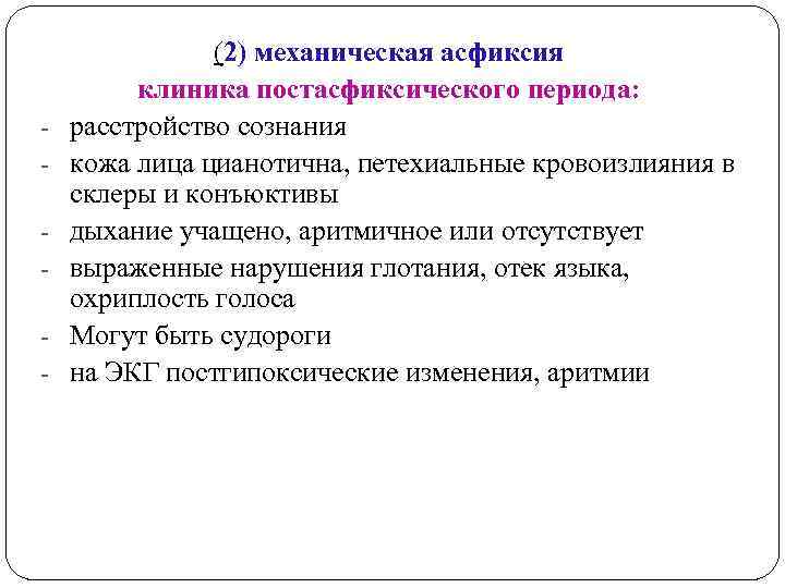 - (2) механическая асфиксия клиника постасфиксического периода: расстройство сознания кожа лица цианотична, петехиальные кровоизлияния в склеры и конъюктивы дыхание учащено, аритмичное или отсутствует выраженные нарушения глотания, отек языка, охриплость голоса Могут быть судороги на ЭКГ постгипоксические изменения, аритмии