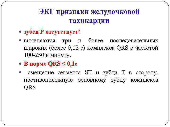 ЭКГ признаки желудочковой тахикардии зубец Р отсутствует! выявляются три и более последовательных широких (более 0, 12 с) комплекса QRS с частотой 100 -250 в минуту. В норме QRS ≤ 0, 1 с смещение сегмента ST и зубца T в сторону, противоположную основному зубцу комплекса QRS