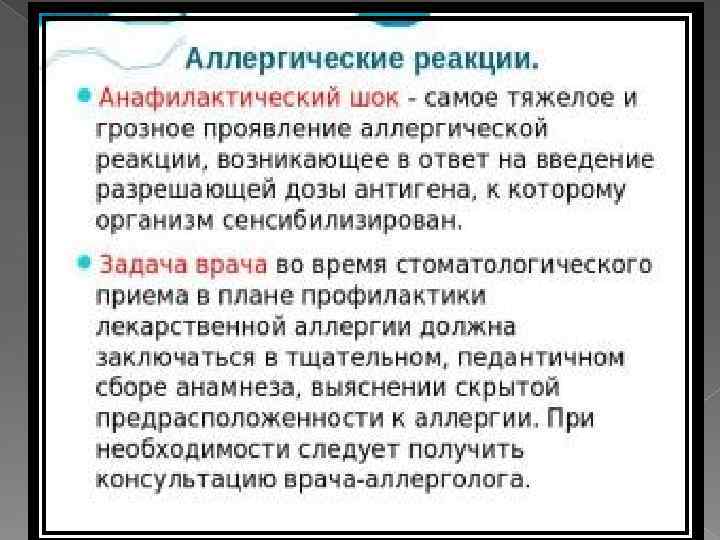 ОЦЕНИТЬ ТЯЖЕСТЬ СОСТОЯНИЕ БОЛЬНОГО ПРЕКРАТИТЬ ВВЕДЕНИЕ ЛЕКАРСТВЕННОГО ПРЕПАРАТА придать горизонтальное положение с приподнятыми ногами; убедиться в проходимости дыхательных путей (отсутствие западения языка, рвотных масс в полости рта) С целью улучшения кровообращения к стопам пострадавшего можно приложить грелку либо бутылки, наполненные теплой водой. Sol. Adrenalini 0, 1% 0, 5 в/в Обколоть место инъекции: Sol. Adrenalini 0, 1% 0, 5 + 5 мл физ. раствора Sol. Dexamethazoni 4 -20 mg в/в. При бронхоспазме и АДс не менее 100 — Sol. Euphyllini 2, 4%-10, 0 в/в.