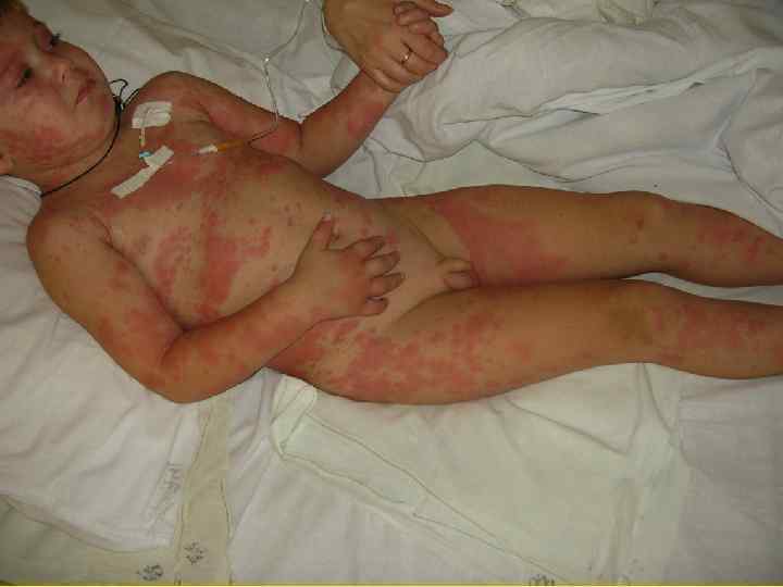 Синдром Стивенса-Джонсона клиника • Симптомы интоксикации • Эрозивные поражения слизистых • Буллезные поражения кожи (10%- 30%) Осложнения: необратимые поражения глаз, стриктуры пищевода, стриктуры уретры