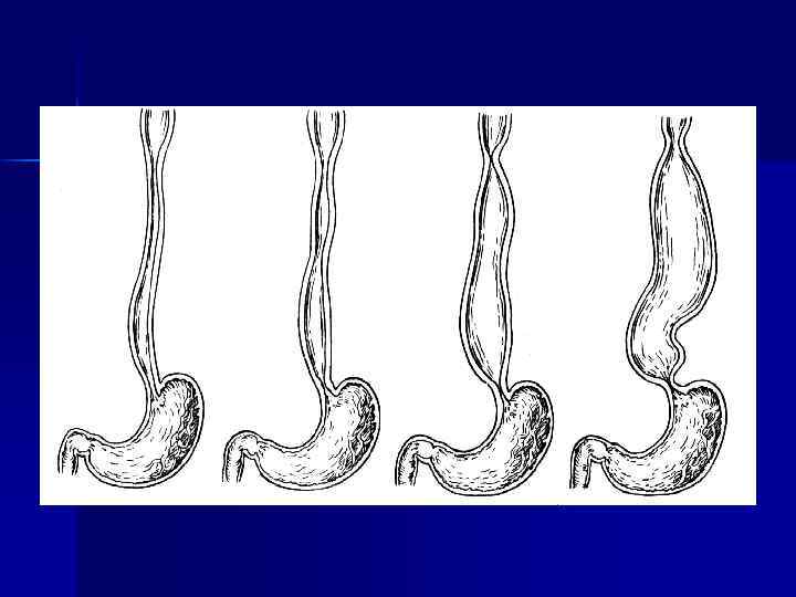 Клиническое течение – 3 стадии n I стадия — компенсации (боль, чувство тяжести в эпигастрии; изжогу, отрыжку. Эпизодически бывает рвота, приносящая облегчение больному) n II стадия — субкомпенсации ( +отрыжка с неприятным запахом тухлых яиц вследствие длительной задержки пищи в желудке. Часто беспокоят коликообразные боли, связанные с усиленной перистальтикой желудка, почти ежедневно возникает обильная рвота. Снижение массы тела) n III стадия — декомпенсации (Состояние больного значительно ухудшается. Отмечается многократная рвота, чувство распирания в эпигастральной области становится тягостным, заставляет больных вызывать рвоту искусственно или промывать желудок через зонд. Рвотные массы (несколько литров) зловонные. Больной истощен, обезвожен)