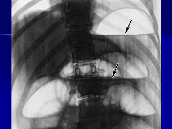 Кишечные аркады. Получаются, когда тонкая кишка оказывается раздутой газами, при этом в нижних коленах аркад видны горизонтальные уровни жидкости. Симптом перистости (поперечная исчерченность в форме растянутой пружины) встречается при высокой кишечной непроходимости и связан с растяжением тощей кишки, имеющей высокие циркулярные складки слизистой. на фоне раздутых газом петель тонкой кишки (1) с уровнями жидкости в них (2) видна поперечная исчерченность (3), придающая петлям вид пружин.