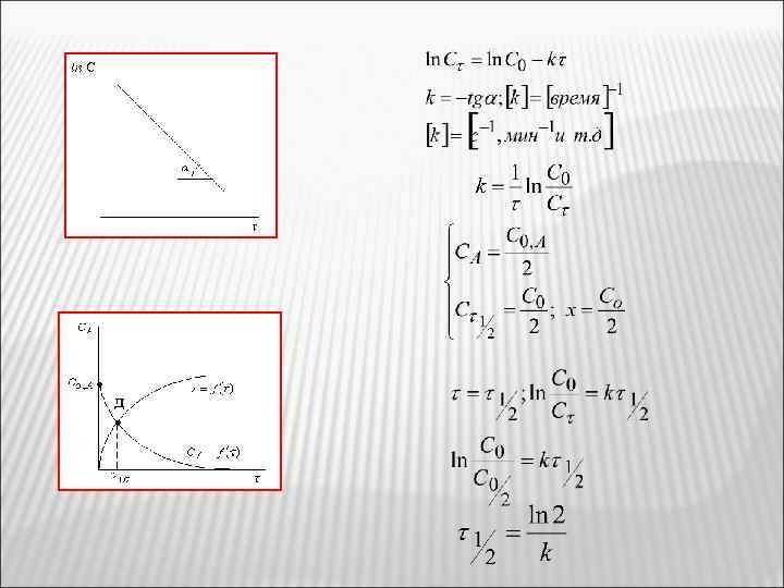 Дифференциальные уравнения скорости реакции I порядка: Это кинетические уравнения реакции I порядка, записанные в интегральной форме. При кинетических исследованиях прямая задача - это определение зависимости с = f(τ), обратная задача- определение к.