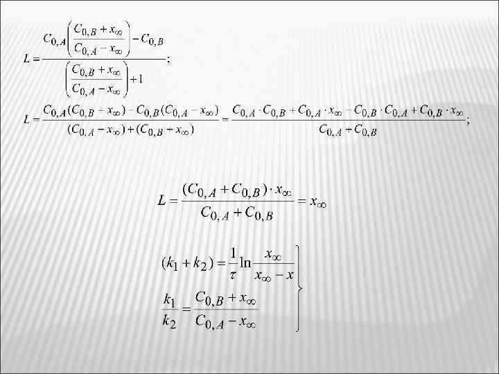 const = - ln L Уравнение позволяет найти сумму (k 1 + k 2), но не дает возможности найти k 1 и k 2. Найти значение k 1 и k 2 можно, исходя из равновесия прямой и обратной реакции, когда Константа равновесия реакции