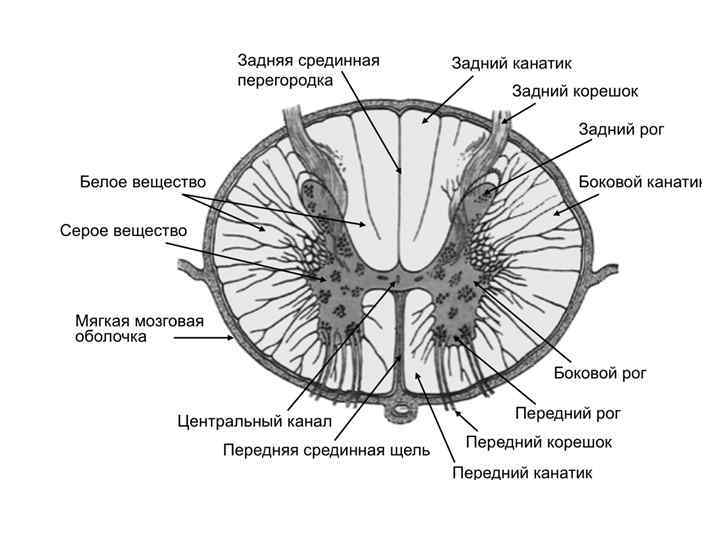 Серое вещество спинного мозга Белое вещество спинного мозга Задний корешок спинного мозга Спинномозговой (чувствительный) узел Спинномозговой смешанный нерв Передний корешок спинного мозга