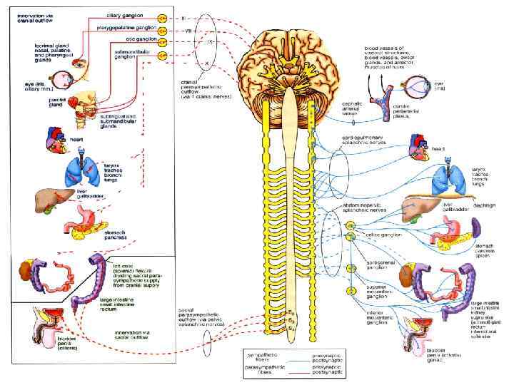 Пресинаптическое парасимпатическое нервное волокно Постсинаптическое симпатическое нервное волокно Подслизистое сплетение ( сплетение Мейснера) Межмышечное (Ауэрбаховское) сплетение