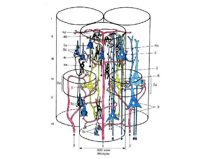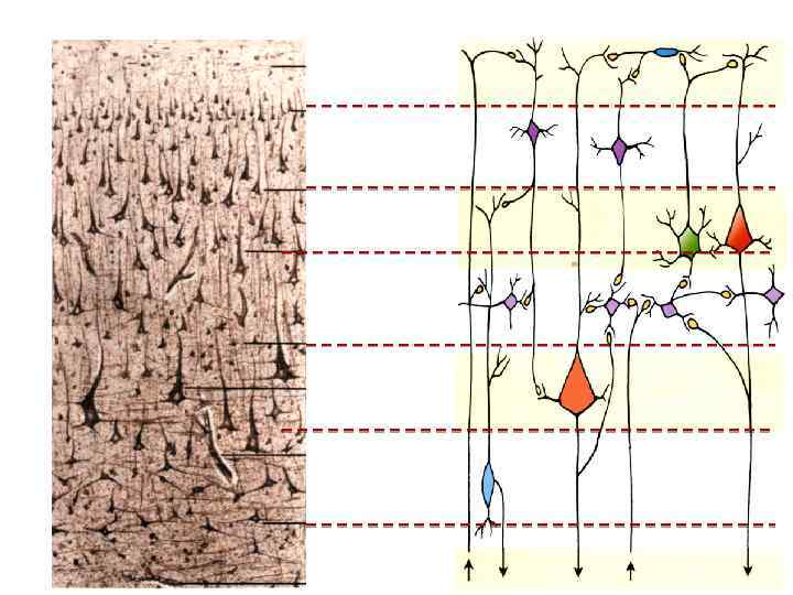 Слои и клетки коры Горизонтальные Клетки Кахаля I -молекулярный Мелкие пирамидные, звездчатые нейроны II -наружный зернистый III -пирамидный Пирамидные Звездчатые IV –внутренний зернистый V -ганглионарный VI -слой полиморфных клеток Большие пирамидные клетки Беца Веретеновидные