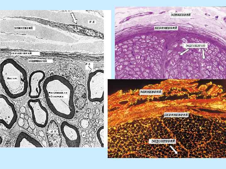 Периферические нервы • Связывают нервные центры ЦНС с рецепторами и рабочими органами. • Пучки миелиновых и безмиелиновых нервных волокон, окруженные с-тк оболочками: • эндоневрий – тонкие прослойки РВСТ, окружающие отдельные нервные волокна и связывающие их в единый пучок: немногочисленные клетки, ретикулярные волокна, мелкие сосуды; • периневрий – покрывает каждый пучок отдаёт перегородки вглубь пучка: 2 -10 концентрических пласта уплощенных клеток, связанных плотными и щелевыми контактами; в пространствах между клетками - коллагеновые волокна и жидкость; • эпиневрий – наружная оболочка из плотной соед. ткани, содержащая жировые клетки, кровеносные и лимфатические сосуды.