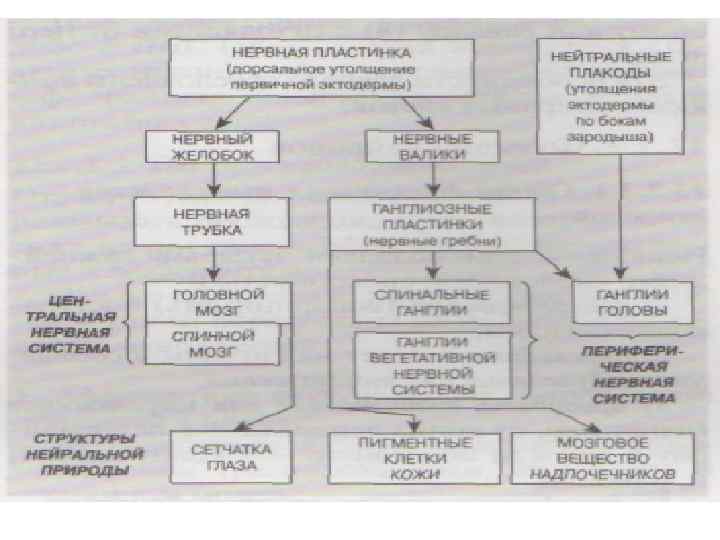 Развитие нервной ткани 1. Образование нервной трубки и нервных гребней - появление нервной пластинки - образование нервных желобка и валиков - образование нервной трубки (из желобка) и нервных гребней (из валиков) 2. Формирование н. с. и др. структур нейральной природы А) Из нервной трубки –головной и спинной мозг Б) Из нервных гребней: нервные узлы (ганглии) ПНС (миграция клеток в мезодерму) меланоциты дермы нейроэндокриноциты 3. Подразделение клеток на нейроны (из нейробластов) глию (из глиобластов)