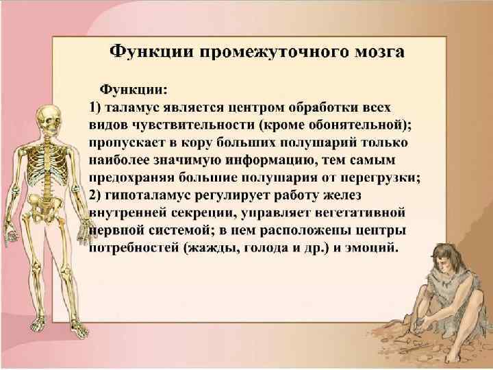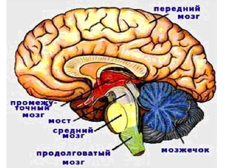 ГОЛОВНОЙ МОЗГ • Средняя масса = 1, 5 -1, 6 кг. • Покрыт 3 -мя оболочками: мягкая, паутинная, твердая. • Отходит 12 пар черепно-мозговых нервов. • Состоит из белого и серого вещества. • Включает 5 отделов: продолговатый, задний (мост и мозжечок), средний, промежуточный, передний. • Стволовую часть образуют: продолговатый, мост, средний и промежуточный мозг.