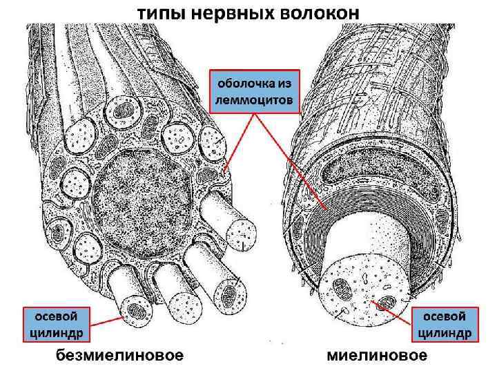 Нервные волокна Безмиелиновые Миелиновые (безмякотные) (мякотные) • Характерны для вегетативной н/с; • Клетки нейроглии плотно прилегают друг к другу; • Содержат несколько отростков различных нейронов. • Содержат один осевой цилиндр (дендрит или аксон нейрона), покрытый оболочкой из глиальных клеток.
