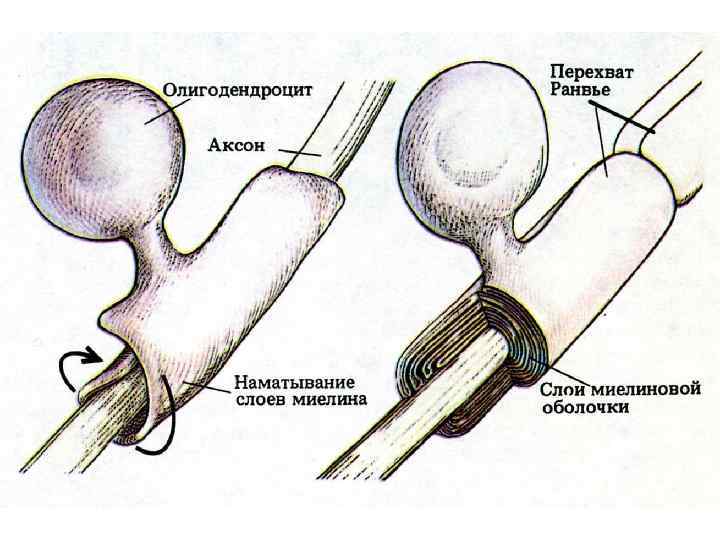 Миелин • Благодаря миелиновой оболочке увеличивается скорость проведения нервного • Ионы могут перемещаться через мембрану аксона в местах, не покрытых миелином, – перехватах Ранвье.