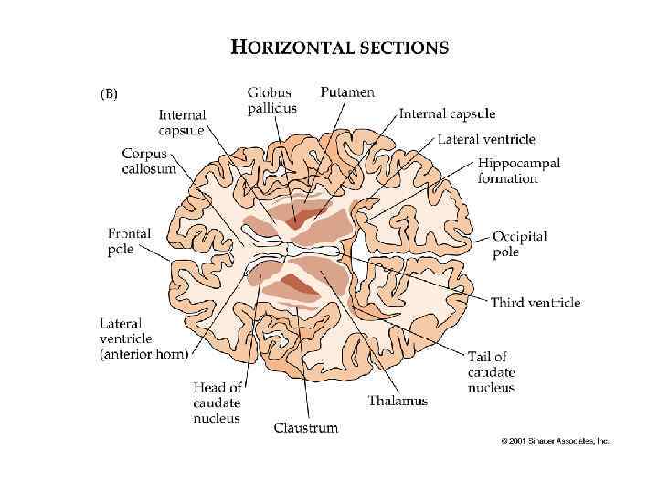 Базальные ганглии • Базальные ганглии – это совокупность ядер (скорлупа, бледный шар и хвостатое ядро), которые участвуют в регуляции координированных движений (запускают и прекращают их).
