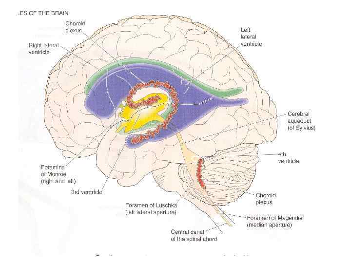 • Полости конечного мозга образуют боковые желудочки, • промежуточного мозга — третий желудочек, • среднего мозга — водопровод среднего мозга (сильвиев водопровод), • ромбовидного мозга — четвертый желудочек • спинного мозга — центральный канал.