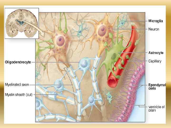 Олигодендроглия Классификация 1. Мантийная (сателлитная) 2. Леммоциты (Шванновские клетки) 3. Свободная олигодендроглия ЦНС 4. Олигодендроглия, принимающая участие в образовании нервных окончаний Функции олигодендроглия барьерно защитная изоляция рецептивных зон и отростков нейроцитов, выработка миелина участие в проведении нервного импульса регуляция метаболизма нейроцитов