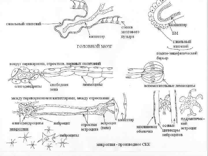 Структура: 1. Нейроны 2. Нейроглия Функции глии: 1. Опорная 2. Трофическая 3. Барьерная, защитная. 4. Секреция ликвора Функции нейронов: 1. Рецепция сигналов. 2. Способность приходить в состояние возбуждения/торможения. 3. Способность проведения нервных импульсов. 4. Передавать нервный импульс нейрону или эф. клетке. 5. Способность хранить информацию.