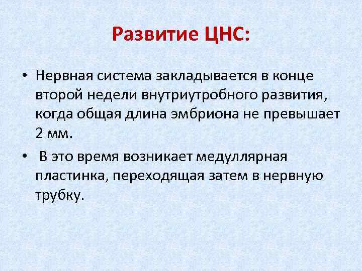 Развитие ЦНС: • Нервная система закладывается в конце второй недели внутриутробного развития, когда общая длина эмбриона не превышает 2 мм. • В это время возникает медуллярная пластинка, переходящая затем в нервную трубку.