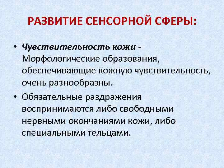 РАЗВИТИЕ СЕНСОРНОЙ СФЕРЫ: • Чувствительность кожи Морфологические образования, обеспечивающие кожную чувствительность, очень разнообразны. • Обязательные раздражения воспринимаются либо свободными нервными окончаниями кожи, либо специальными тельцами.
