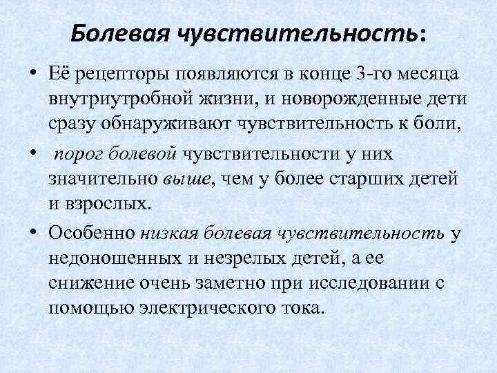 Болевая чувствительность: • Её рецепторы появляются в конце 3 -го месяца внутриутробной жизни, и новорожденные дети сразу обнаруживают чувствительность к боли, • порог болевой чувствительности у них значительно выше, чем у более старших детей и взрослых. • Особенно низкая болевая чувствительность у недоношенных и незрелых детей, а ее снижение очень заметно при исследовании с помощью электрического тока.