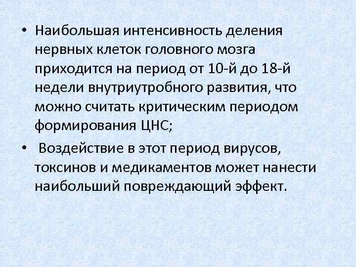 • Наибольшая интенсивность деления нервных клеток головного мозга приходится на период от 10 й до 18 й недели внутриутробного развития, что можно считать критическим периодом формирования ЦНС; • Воздействие в этот период вирусов, токсинов и медикаментов может нанести наибольший повреждающий эффект.
