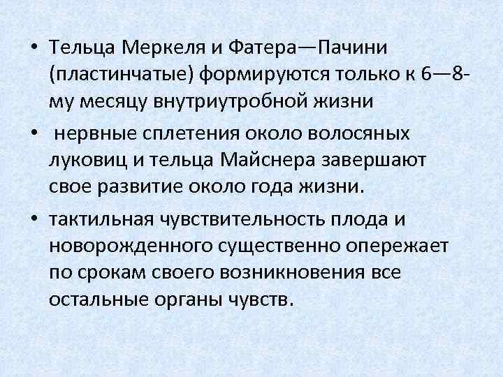 • Тельца Меркеля и Фатера—Пачини (пластинчатые) формируются только к 6— 8 му месяцу внутриутробной жизни • нервные сплетения около волосяных луковиц и тельца Майснера завершают свое развитие около года жизни. • тактильная чувствительность плода и новорожденного существенно опережает по срокам своего возникновения все остальные органы чувств.
