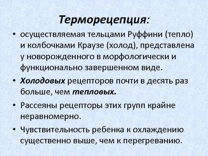 Терморецепция: • осуществляемая тельцами Руффини (тепло) и колбочками Краузе (холод), представлена у новорожденного в морфологически и функционально завершенном виде. • Холодовых рецепторов почти в десять раз больше, чем тепловых. • Рассеяны рецепторы этих групп крайне неравномерно. • Чувствительность ребенка к охлаждению существенно выше, чем к перегреванию.