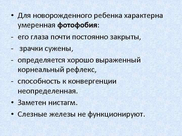 • Для новорожденного ребенка характерна умеренная фотофобия: его глаза почти постоянно закрыты, зрачки сужены, определяется хорошо выраженный корнеальный рефлекс, способность к конвергенции неопределенная. • Заметен нистагм. • Слезные железы не функционируют.