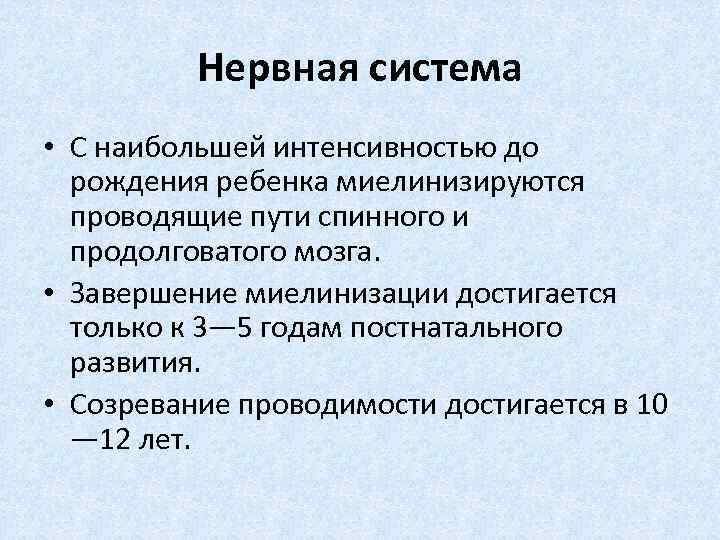 Нервная система • С наибольшей интенсивностью до рождения ребенка миелинизируются проводящие пути спинного и продолговатого мозга. • Завершение миелинизации достигается только к 3— 5 годам постнатального развития. • Созревание проводимости достигается в 10 — 12 лет.