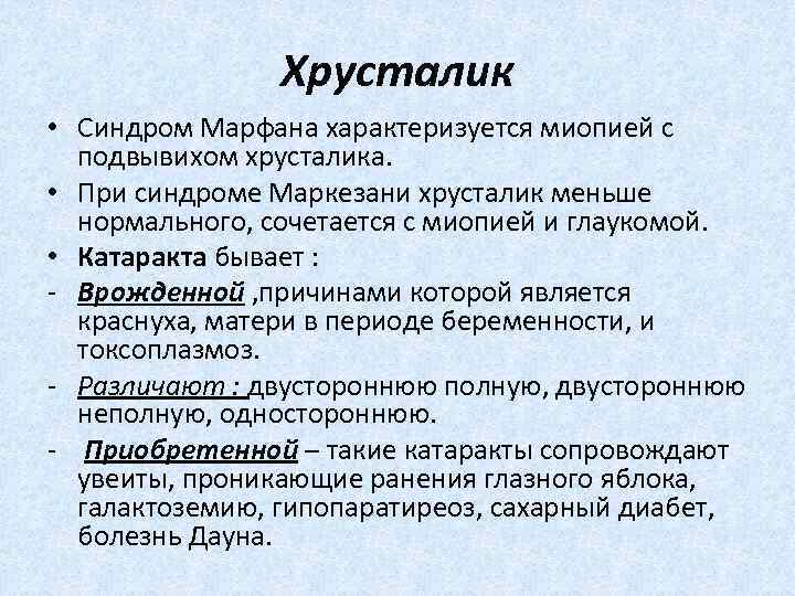 Хрусталик • Синдром Марфана характеризуется миопией с подвывихом хрусталика. • При синдроме Маркезани хрусталик меньше нормального, сочетается с миопией и глаукомой. • Катаракта бывает : Врожденной , причинами которой является краснуха, матери в периоде беременности, и токсоплазмоз. Различают : двустороннюю полную, двустороннюю неполную, одностороннюю. Приобретенной – такие катаракты сопровождают увеиты, проникающие ранения глазного яблока, галактоземию, гипопаратиреоз, сахарный диабет, болезнь Дауна.