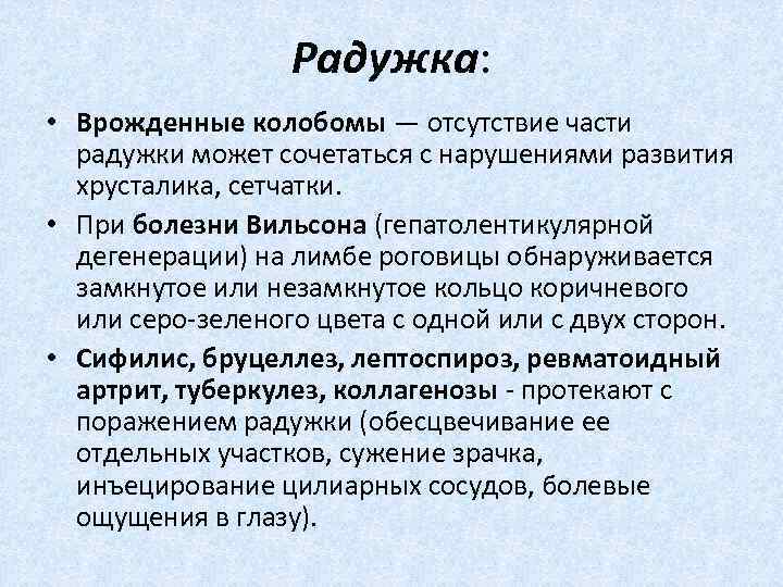 Радужка: • Врожденные колобомы — отсутствие части радужки может сочетаться с нарушениями развития хрусталика, сетчатки. • При болезни Вильсона (гепатолентикулярной дегенерации) на лимбе роговицы обнаруживается замкнутое или незамкнутое кольцо коричневого или серо зеленого цвета с одной или с двух сторон. • Сифилис, бруцеллез, лептоспироз, ревматоидный артрит, туберкулез, коллагенозы протекают с поражением радужки (обесцвечивание ее отдельных участков, сужение зрачка, инъецирование цилиарных сосудов, болевые ощущения в глазу).
