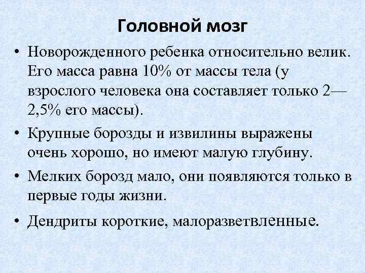 Головной мозг • Новорожденного ребенка относительно велик. Его масса равна 10% от массы тела (у взрослого человека она составляет только 2— 2, 5% его массы). • Крупные борозды и извилины выражены очень хорошо, но имеют малую глубину. • Мелких борозд мало, они появляются только в первые годы жизни. • Дендриты короткие, малоразветвленные.