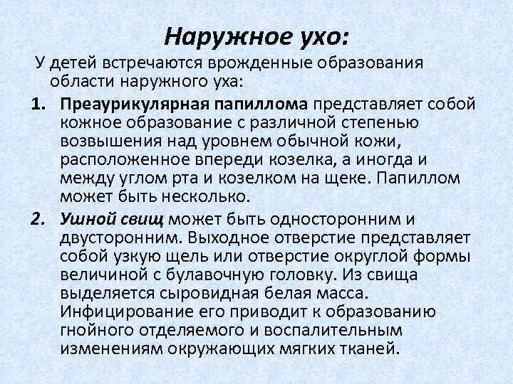 Наружное ухо: У детей встречаются врожденные образования области наружного уха: 1. Преаурикулярная папиллома представляет собой кожное образование с различной степенью возвышения над уровнем обычной кожи, расположенное впереди козелка, а иногда и между углом рта и козелком на щеке. Папиллом может быть несколько. 2. Ушной свищ может быть односторонним и двусторонним. Выходное отверстие представляет собой узкую щель или отверстие округлой формы величиной с булавочную головку. Из свища выделяется сыровидная белая масса. Инфицирование его приводит к образованию гнойного отделяемого и воспалительным изменениям окружающих мягких тканей.