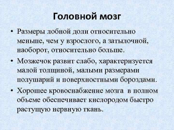 Головной мозг • Размеры лобной доли относительно меньше, чем у взрослого, а затылочной, наоборот, относительно больше. • Мозжечок развит слабо, характеризуется малой толщиной, малыми размерами полушарий и поверхностными бороздами. • Хорошее кровоснабжение мозга в полном объеме обеспечивает кислородом быстро растущую нервную ткань.