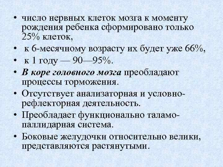 • число нервных клеток мозга к моменту рождения ребенка сформировано только 25% клеток, • к 6 -месячному возрасту их будет уже 66%, • к 1 году — 90— 95%. • В коре головного мозга преобладают процессы торможения. • Отсутствует анализаторная и условно- рефлекторная деятельность. • Преобладает функционально таламо- паллидарная система. • Боковые желудочки относительно велики, представляются растянутыми.