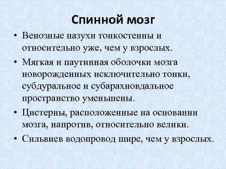 Спинной мозг • Венозные пазухи тонкостенны и относительно уже, чем у взрослых. • Мягкая и паутинная оболочки мозга новорожденных исключительно тонки, субдуральное и субарахновдальное пространство уменьшены. • Цистерны, расположенные на основании мозга, напротив, относительно велики. • Сильвиев водопровод шире, чем у взрослых.