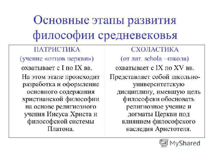 ПАТРИСТИКА - (от греч. , лат. pater — отец; имеются в виду Отцы церкви) — термин, обозначающий совокупность теологических и религиозно-философских сочинений христианских писателей I-IX вв. – Отцов церкви. 1. Характерной особенностью средневекового философского мышления, свойственного патристике, является то, что мыслители в целях подтверждения своих идей обращаются к самому авторитетному и древнему источнику — Библии. Она рассматривается ими как полный свод истин, сообщенных людям Богом. Следовательно, важно уяснить смысл библейских текстов, чтобы получить ответы на философские вопросы. Отсюда задача философа сводится к тому, чтобы раскрыть, выявить подлинный смысл положений Библии и отразить их в своих собственных сочинениях. 2. Занимались оформлением единого христианского вероучения, уточняли догматы, занималась обоснованием учения о Троице, осмысливала тезис о двуединой природе Христа, разрабатывала космологические, антропологические, религиозноэтические проблемы. 3. В этот период разрабатываются канонические правила для духовенства и монашества. 4. Патристика боролась с язычеством и пропагандировала этико-религиозную доктрину христианства в мире, еще не вполне принявшем новую религию и утверждающую его мораль.