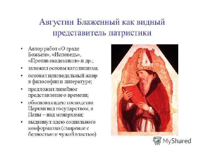Августин обосновывал и оправдывал существование имущественного неравенства людей в обществе. Он утверждал, что неравенство — неизбежное явление социальной жизни и бессмысленно стремиться к уравнению богатств; оно будет существовать во все века земной жизни человека. Но все же все люди равны перед Богом и потому Августин призывал жить в мире. Государство — наказание за первородный грех; является системой господства одних людей над другими; оно предназначено не для достижения людьми счастья и блага, а только для выживания в этом мире. Справедливое государство — христианское государство. Функции государства: обеспечение правопорядка, защита граждан от внешней агрессии, помогать Церкви и бороться с ересью. Войны могут быть справедливыми и несправедливыми. Справедливые — те, что начались по законным причинам, например по необходимости отражения нападения врагов. Концепция линейного исторического времени по Августину: первая эпоха — от Адама до Великого потопа вторая — от Ноя до Авраама третья — от Авраама до Давида четвёртая — от Давида до Вавилонского пленения пятая — от Вавилонского пленения до рождения Христа шестая — началась с Христа и завершится вместе с концом истории вообще и со Страшным Судом седьмая — вечность