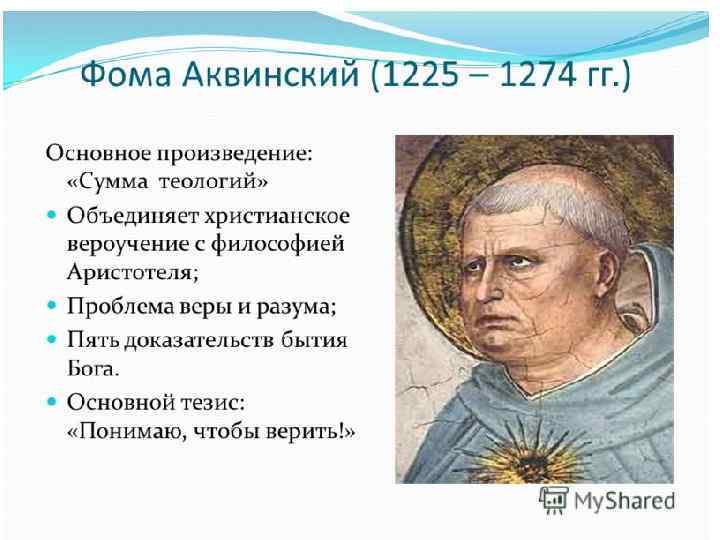 В произведении “Сумма теологии” приводятся пять доказательств существования Бога Фомы Аквинского: 1. Все в мире движется за счет чего-то другого, значит должен быть Один Перводвигатель. И этот Перводвигатель - Бог! 2. Все в мире происходит благодаря Причинно-Следственной связи. Причем причина всегда идет вначале, а следствие - в конце. Значит, весь ряд мирских событий должен иметь некую Первопричину. Это и есть Бог! 3. Все, что происходит в мире, необходимо этому миру. Из пустоты можно получить только пустоту. Ничто рождает ничто. Значит, должно быть что-то, чье существование влечет за собой существование всего остального, обеспечивает Бытие всего мира. Это что-то и есть Бог! 4. Все вещи в мире обладают разной степенью совершенства. Даже люди есть более совершенные и менее. Значит есть нечто "абсолютно более совершенное", к чему стремится любое несовершенство. Это совершенство и есть Бог! 5. Все в мире стремится к какой-то одной конкретной цели. Как человеческие поступки всегда имеют конкретную цель, ради которой совершаются, так есть и некая Цель, ради которой существует этот мир. Эта Цель - Бог!
