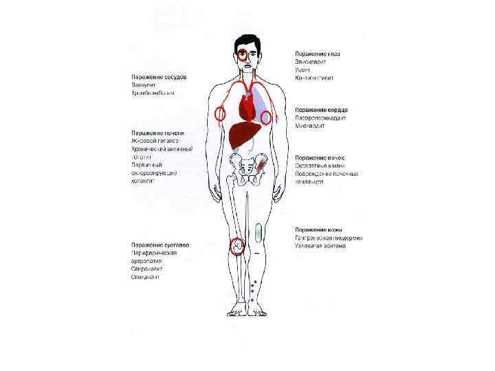 КЛИНИЧЕСКАЯ КАРТИНА ОБОСТРЕНИЯ • Внекишечные симптомы: • Анемия, лихорадка от субфибрильных цифр до высоких. • Чувство болезни, снижение веса. • Артралгия. • Узловатая эритема. • Фликтенулезный (лимфатический) коньюктивит. • «Сопутствующие» заболевания --Первично склерозирующий холангит. --Амилоидоз. Гепатоз.
