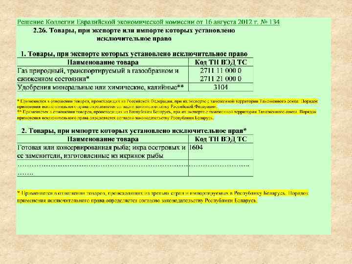Единый перечень товаров, к которым применяются запреты или ограничения на ввоз или вывоз государствами - участниками таможенного союза в рамках Евразийского экономического сообщества в торговле с третьими странами и Положения о применении ограничений. (Решение Коллегии Евразийской экономической комиссии от 16 августа 2012 г. № 134) Раздел 1. Товары, запрещенные к перемещению через границу Таможенного союза. Раздел 2. Товары, ограниченные к перемещению через границу Таможенного союза.