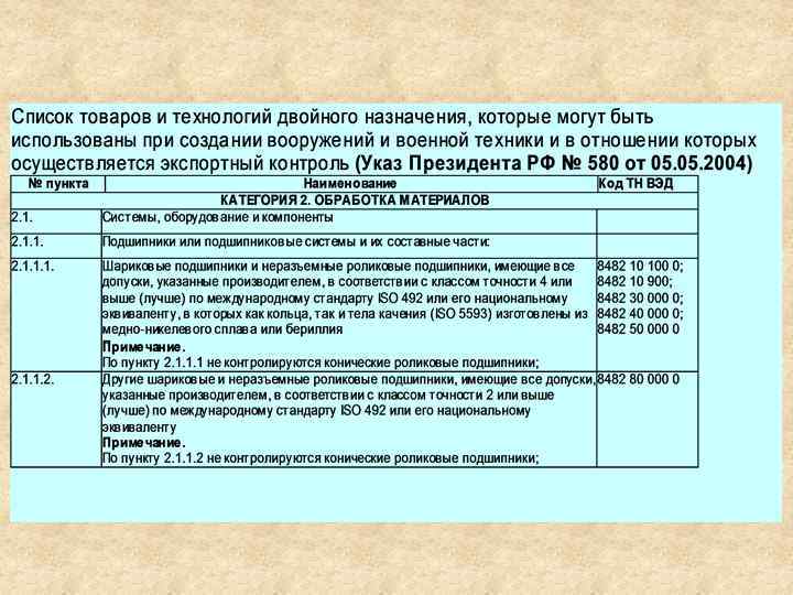 К числу товаров двойного назначения относятся: отдельные виды сырья, материалы, оборудование, технологии и научнотехническая информация, которые могут быть применимы при создании вооружения и военной техники; оборудование, материалы и технологии, применяющиеся при создании ракетного оружия; оборудование, материалы двойного использования и соответствующие технологии, применяемые в ядерных целях; химикаты, оборудование и технологии, которые имеют мирное назначение, но могут использоваться при создании химического оружия; возбудители заболеваний, (патогены) человека, животных и растений, генетически измененные формы микроорганизмов, токсинов, оборудование и технологии, которые могут быть применены при создании бактериологического (биологического) и токсинного оружия.