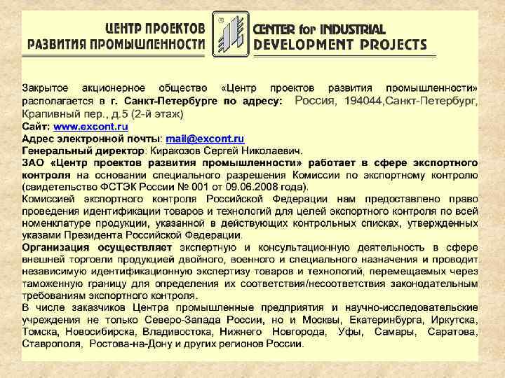 Нормативные документы в области экспортного контроля Приказ ФСТЭК России № 293 от 14 октября 2008 года «Об утверждении требований к заполнению заявления о предоставлении лицензии на осуществление внешнеэкономических операций с контролируемой продукцией и требований к заполнению лицензии на осуществление внешнеэкономических операций с контролируемой продукцией» Постановление Правительства Российской Федерации № 75 от 15 февраля 2011 года «Об определении пунктов пропуска через государственную границу Российской Федерации для прибытия в Российскую Федерацию и убытия из Российской Федерации ядерных материалов, а также содержащих их товаров» Письмо ФТС России № 14 -68/05920 от 10 февраля 2014 года «Перечень товаров, в отношении которых ФСТЭК России принято идентификационное решение о неприменении запретов и ограничений, предусмотренных законодательством Российской Федерации в области экспортного контроля (пятая редакция)»