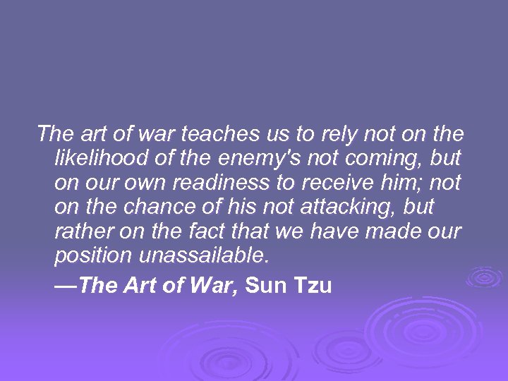 The art of war teaches us to rely not on the likelihood of the enemy's not coming, but on our own readiness to receive him; not on the chance of his not attacking, but rather on the fact that we have made our position unassailable. —The Art of War, Sun Tzu