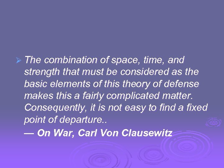 Ø The combination of space, time, and strength that must be considered as the basic elements of this theory of defense makes this a fairly complicated matter. Consequently, it is not easy to find a fixed point of departure. . — On War, Carl Von Clausewitz