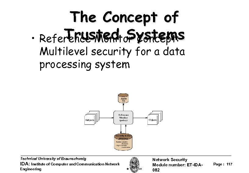 The Concept of Trusted Systems • Reference Monitor Concept: Multilevel security for a data processing system Technical University of Braunschweig IDA: Institute of Computer and Communication Network Engineering W. Adi 2005 Network Security Module number: ET-IDA 082 Page : 117